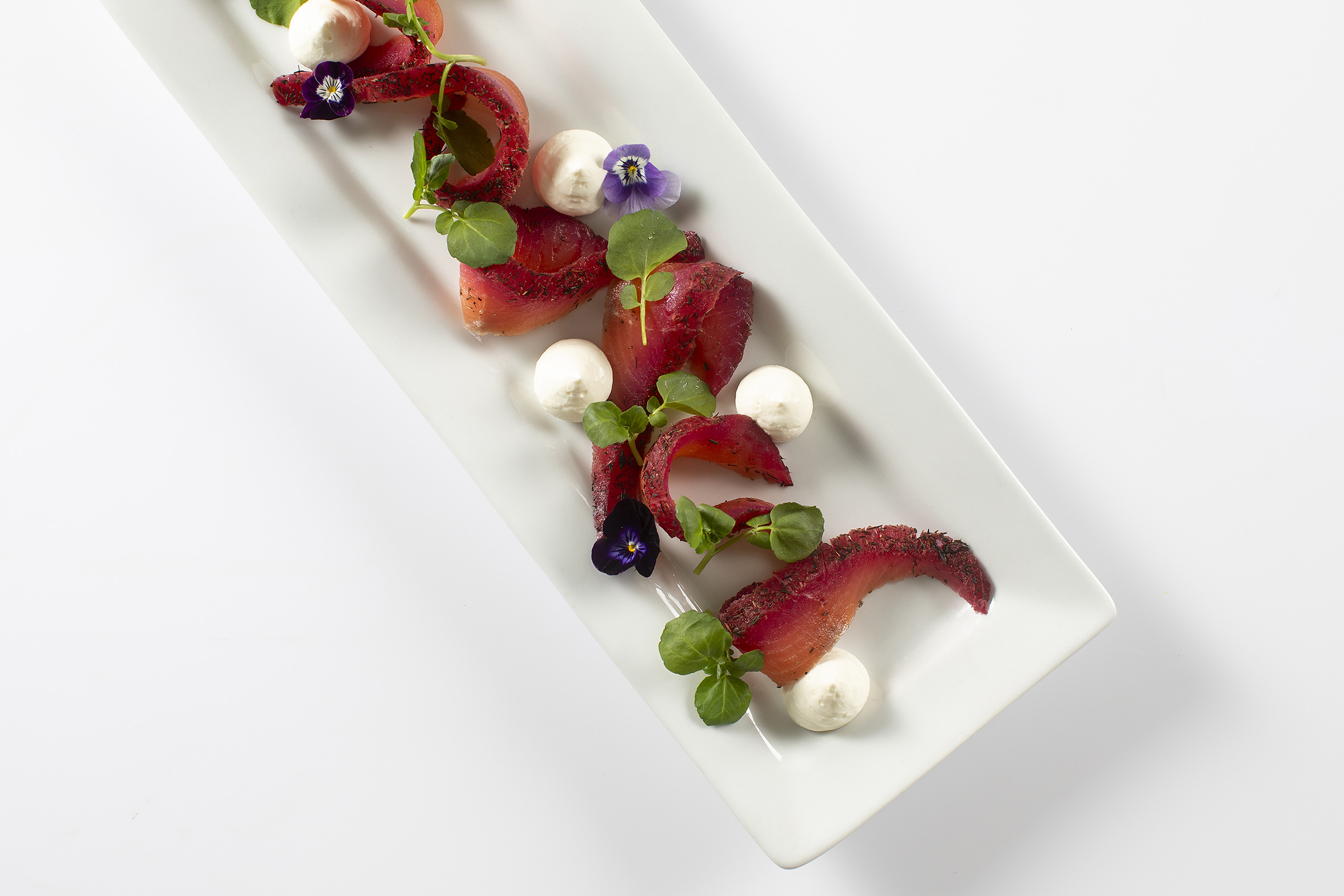- Rødbedelaks med brøndkarse og rygeostcreme.
